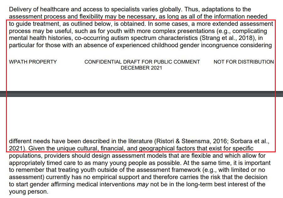 And I included a screenshot of the sentence I would soon be accused of misunderstanding, right from the adolescent section of the WPATH SoC: “In some cases, a more extended assessment process may be useful, such as for youth with more complex presentations (e.g., complicating mental health histories (Leibowitz & de Vries, 2016)), co-occurring autism spectrum characteristics (Strang, Powers et al., 2018), and/or an absence of experienced childhood gender incongruence (Ristori & Steensma, 2016).”
