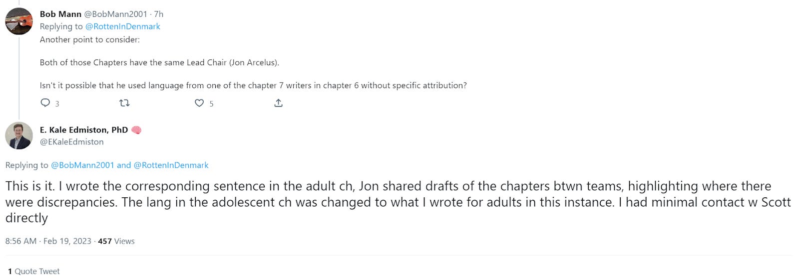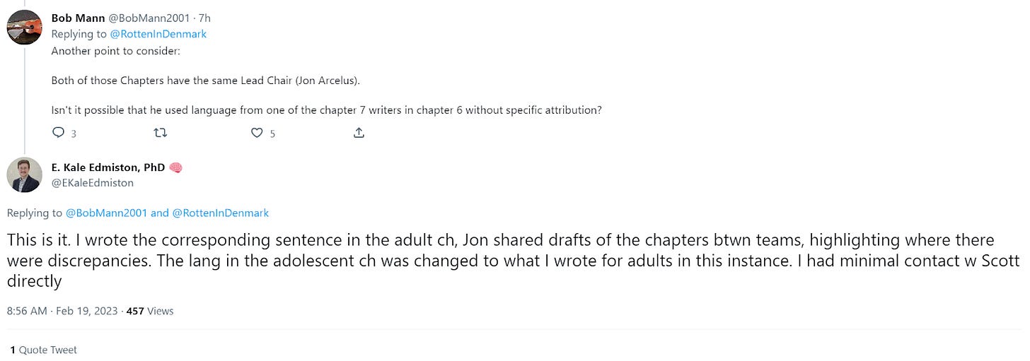 Of course, this whole thing started when Edmiston said he authored one specific sentence in the adolescent section — a sentence the co-chair of that chapter insisted, to me, he didn’t write. Even if he was on a call with Leibowitz, of course that doesn’t mean he wrote the sentence in question, which must have gone through numerous drafts and back-and-forths between the listed members of that particular committee. Edmiston’s mention of his dissertation subject also doesn’t make sense here: the sentence in question was much broader than that, and autism was only one of a number of potentially complicating factors mentioned in it. “[W]e hashed out this autism issue” — how could the sentence in dispute, which is mostly not about autism, be the result of hashing out an autism issue?