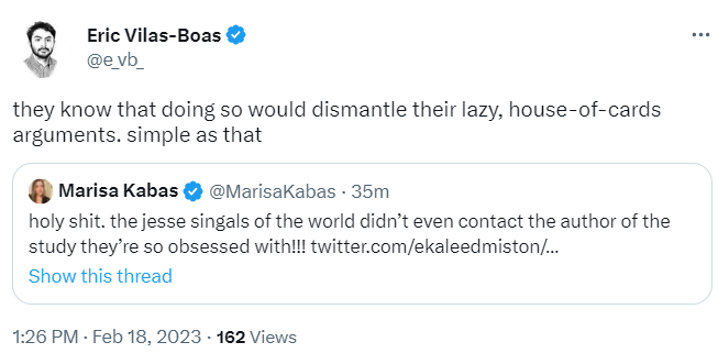 Hobbes was disgusted that I was pushing back on Twitter and asking Edmiston to reconcile his claim with the text of the chapter he coauthored. “Carry yourself with the confidence of Jesse Singal lecturing a researcher on how to interpret his own work,” he tweeted.