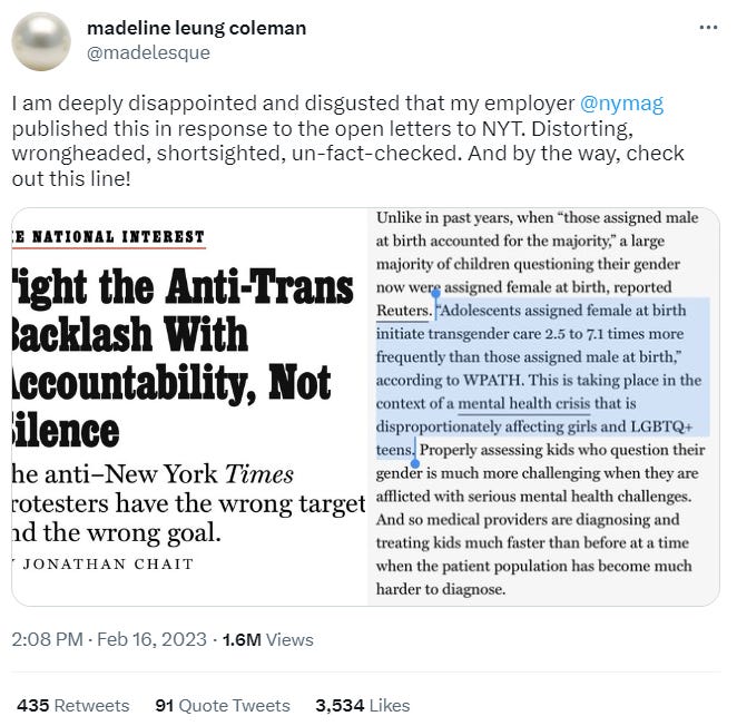 From where I sat, this tidily supported Chait’s argument that if far more kids with other mental health problems are seeking youth gender care than used to, we should put a premium on assessment — and on journalistic scrutiny of youth gender clinicians. I also replied to the NY Mag staffers who had been criticizing Chait, linking to my other tweet and saying “genuinely don’t get what a fact-checker would have flagged here -- this is a fairly basic principle of working with kids with GD, straight from WPATH.”