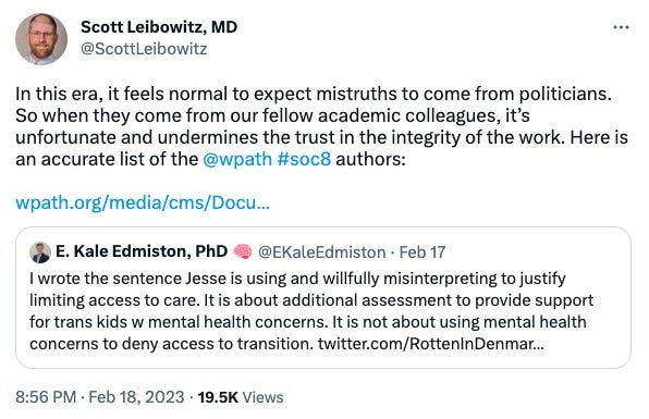 With no word from Edmiston, I tweeted: “Dr. E. Kale Edmiston said I misinterpreted a sentence in the WPATH SoC he himself wrote. I reached out to Scott Leibowitz, co-chair of the chapter in question: ‘I have never heard of that person in my life... and that sentence was certainly not written by them whatsoever.’ [shrug emoji]”
