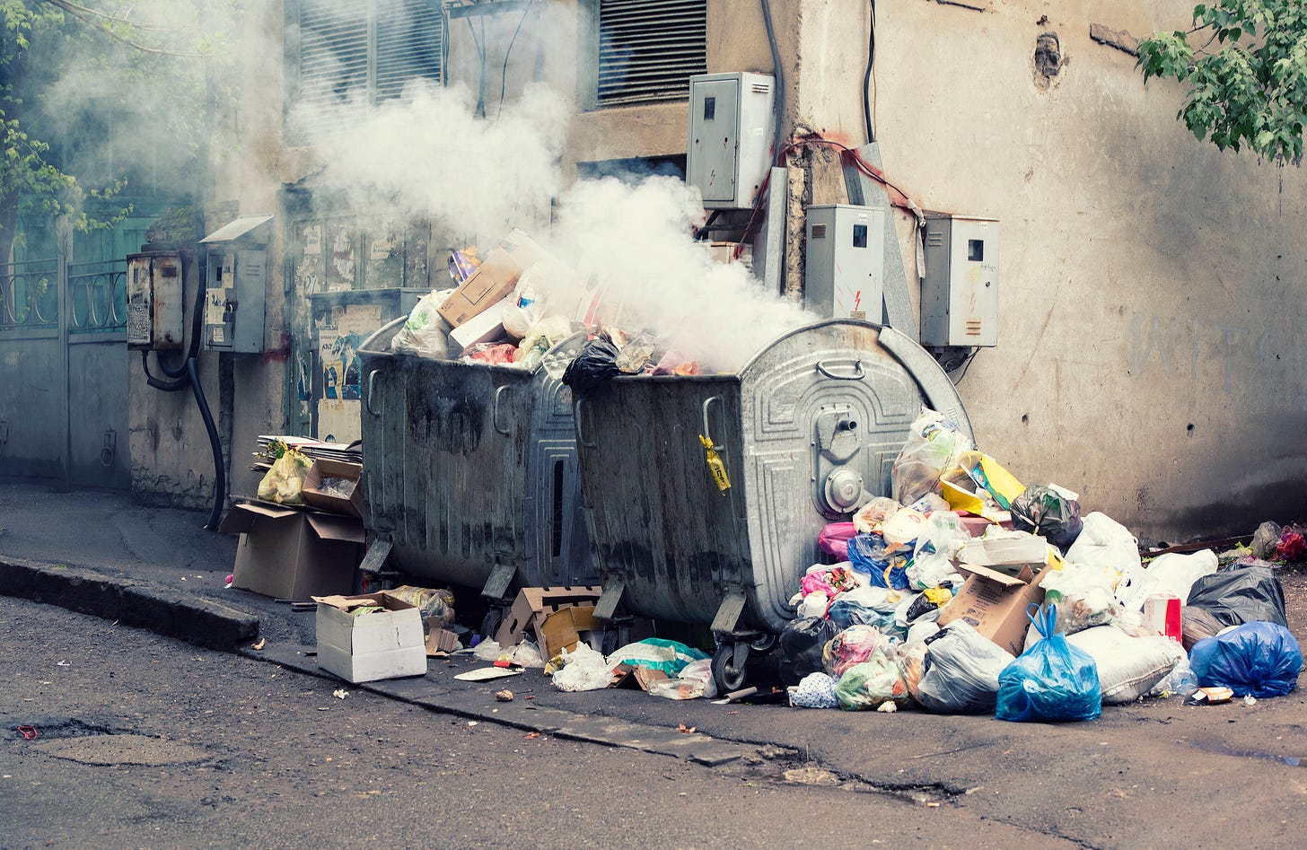 Image: “Burning rubbish dumpster in city, next to the full container rubbish is lying on the street” via Getty. I wanted to ask DALL-E to produce art responding to the prompt “a field of burning dumpsters as far as the eye can see, cyberpunk style,” but alas, the site was down.