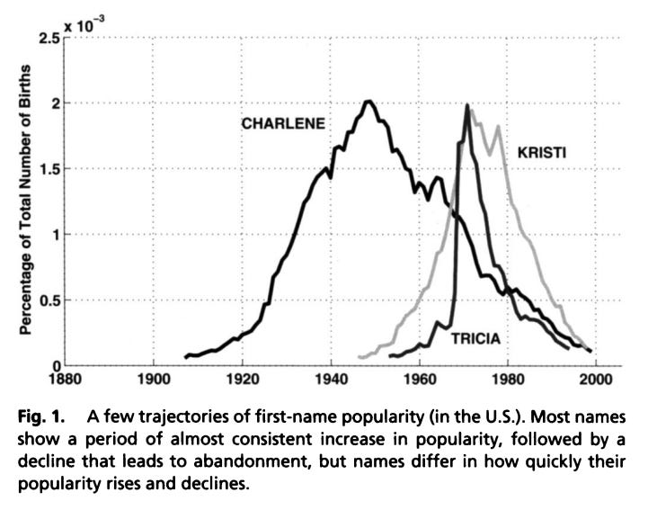 The classic example of fashions in the sociology literature are baby names, which rise and then fall. See Lieberson’s Matter of Taste (2000). Indeed, Berger and Le Mens PNAS 2009 shows that names that rise quickly also fall quickly.