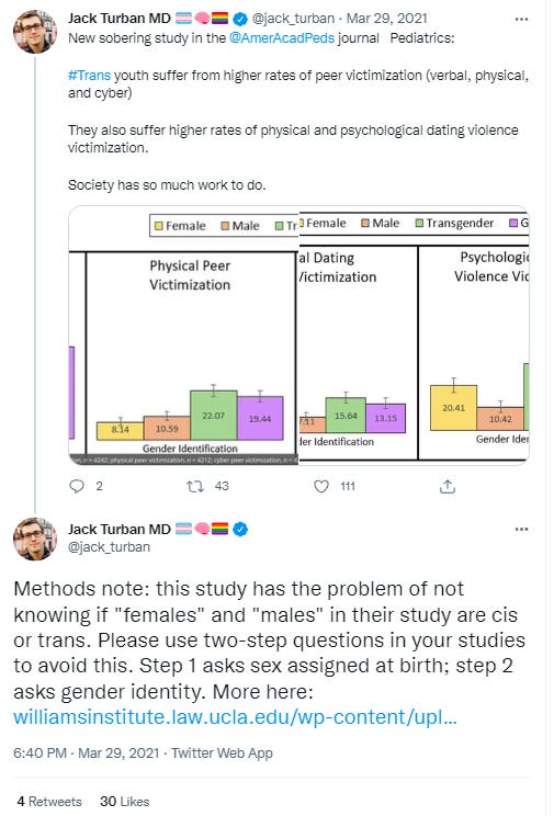 Another researcher, writing on Twitter about a different Pediatrics study in 2021, made the same point more generally: “Methods note: this study has the problem of not knowing if ‘females’ and ‘males’ in their study are cis or trans. Please use two-step questions in your studies to avoid this. Step 1 asks sex assigned at birth; step 2 asks gender identity.”