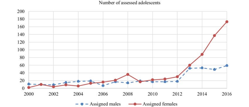This clinic from California reported that from 2015 to 2018, the number of referrals per year tripled, and “73% were assigned female sex at birth,” which is quite a skew (I didn’t read the whole thing carefully, but I don’t think the authors included data on whether that percentage increased over time).