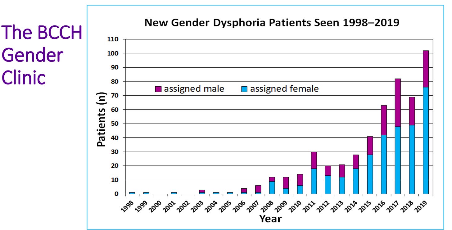 And here’s a graph from the Gender Clinic at British Columbia Children’s Hospital, via a public event put on by Trans Youth CAN!: