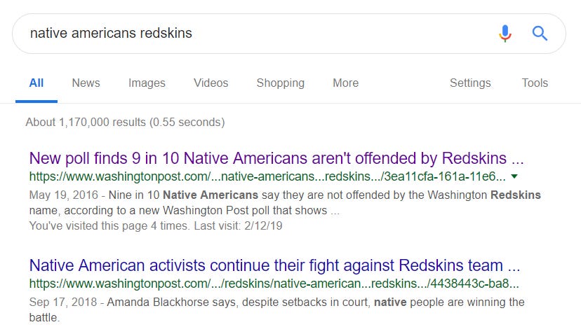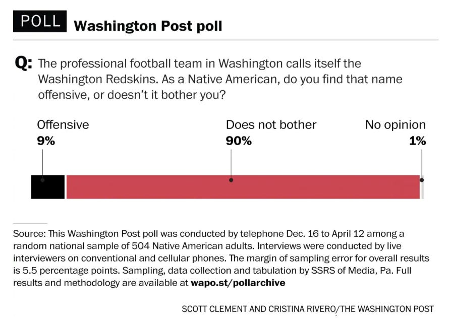 There’s something similar going on with a controversy that, to me, is a much easier call: the Washington, erm, football team. I’m of the belief that the logo and name are offensive and should absolutely be changed. Which, it turns out, is an opinion held by a mere 9% of actual Native Americans, according to a 2016 Washington Post poll: