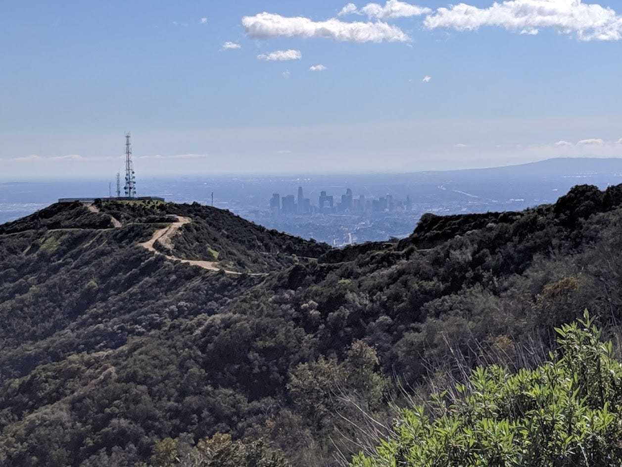 (My last day in Los Angeles, I went for a hike with my oldest friend and his very cute, very chatty 2-year-old, who rode in one of those backpack-things. It was all uphill for the first half or so of the hike, and near its apex, this was the view — it was rare, my friend said, for the LA air to be so clear one could see all the way to the Pacific, and he said the fact that it had been raining most of the week was likely the reason why.)