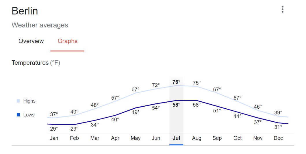 Greetings from Berlin. One of many amazing things about this city is that the weather is wonderfully mild in the summer, by swampy New York standards.