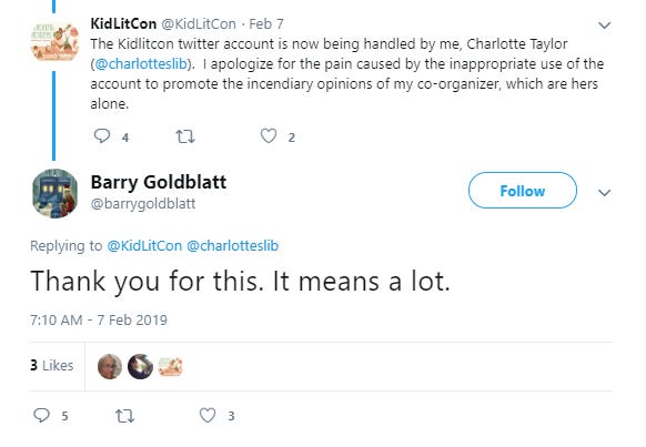 As a result of Goldblatt’s pressure, complete control of the KidLitCon account, which had apparently been shared, was handed over to a white woman who is on Goldblatt’s side on this issue, who promptly “aplogize[d] for the pain caused by the inappropriate use of the account to promote the incendiary opinions of [her] co-organizer”:
