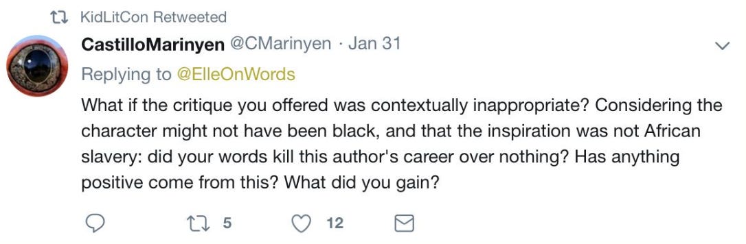 I’m sending you this because I believe the community needs to change. It’s destroying itself. What started out as, in my opinion, an important effort to diversify books for children has become embroiled in far too much public grandstanding and private backstabbing. Debut authors — the targets of a majority of the latest call outs — do not have the industry or social clout within the community to push back or, really, to even recover career-wise from cancelling their books. It's even more difficult when they are marginalized people themselves.