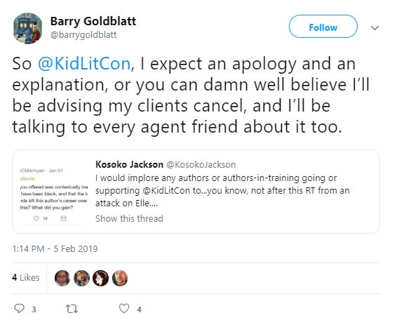 Goldblatt quite transparently threatened that if @KidLitCon didn’t issue an apology for retweeting something he disagreed with, he would tell his clients not to attend the convention, and would spread the word to other agents as well, which could presumably have disastrous consequences for the event: