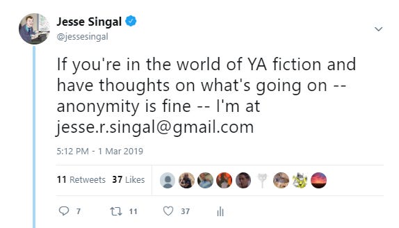 One more time: If you have any sort of insight into the YA Twitter wars, or experience in the trenches, that you think I should know about, email me at jesse.r.singal@gmail.com. I will respect confidentiality. And please don’t think I’m only willing to publish emails supporting my thesis that things have flown off the rail — there are obviously some people who think that what’s been happening is justified, or is a necessary step on some longer journey, and I’d love to hear from some of you, too.