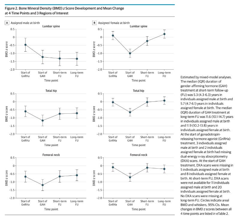 Now, to be clear, the study did offer some positive results. The authors used a Z-score, which is a measure of someone’s bone density relative to the average of someone of the same age and sex. On five of the six bone-mineral density measures the authors evaluated, the study participants had more or less caught up to where they were at the initiation of blockers by the time the researchers did their “short-term follow-up,” about 5.3 years after they started hormones.