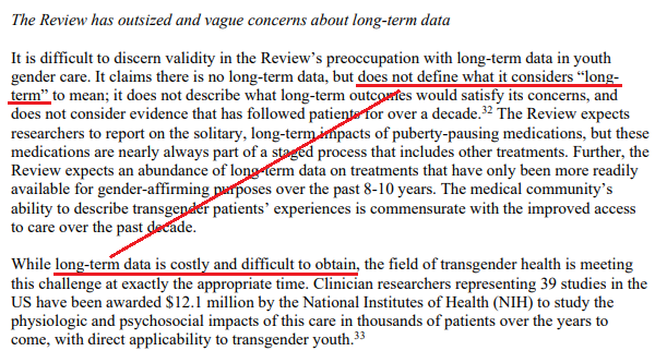 It is difficult to discern validity in the Review’s preoccupation with long-term data in youth gender care. It claims there is no long-term data, but does not define what it considers “long-term” to mean; it does not describe what long-term outcomes would satisfy its concerns, and does not consider evidence that has followed patients for over a decade. [15–16]