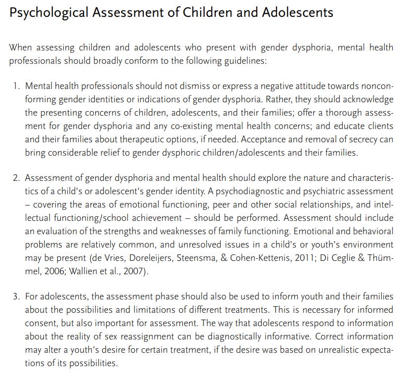 McNamara and her co-authors are being a little bit slippery in their language here by referencing written standards, which often do nod to the importance of assessment, rather than their own opinions. But these standards are totally nonbinding and have tended to be quite vague. The second most-recent version of the World Professional Association for Transgender Healthcare’s Standards of Care, Version 7, had almost nothing about assessment.
