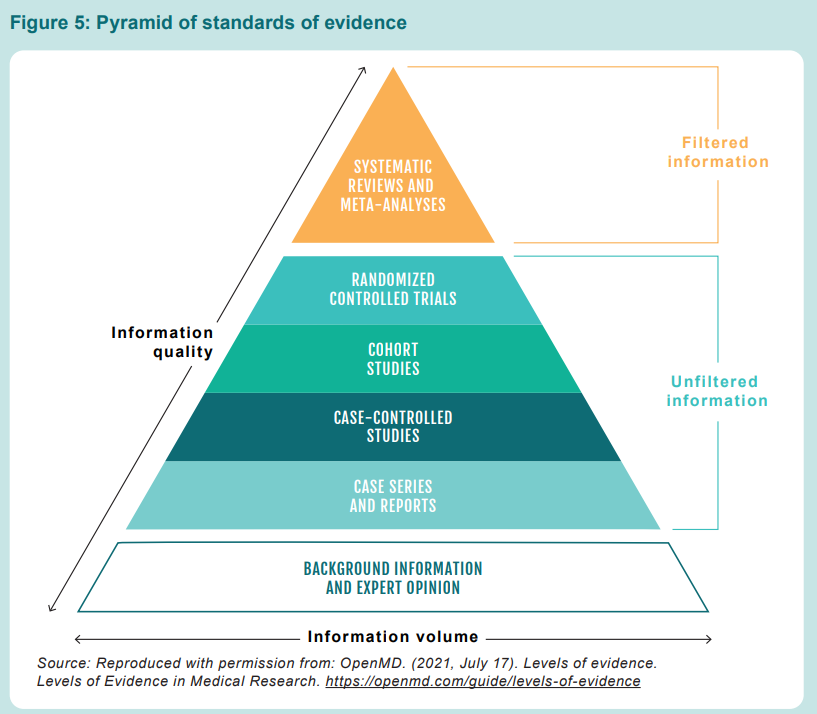 EBM has established a clear hierarchy elucidating the differences between weaker versus stronger types of evidence. Hilary Cass and her team include this pyramid in their report: