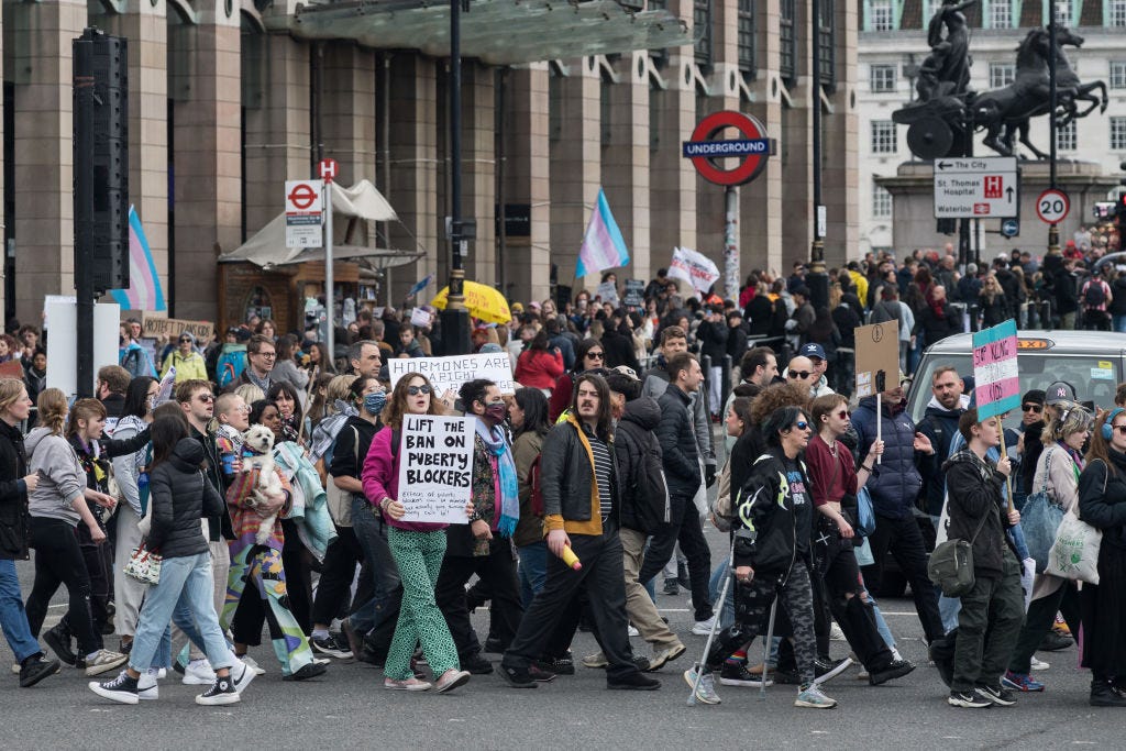 LONDON, UNITED KINGDOM - APRIL 20, 2024: Transgender people and their supporters march through central London in a protest against a ban on puberty blockers in London, United Kingdom on April 20, 2024. From April 1 National Health Service (NHS) as well as private clinics stopped prescribing drugs suppressing sex hormones during puberty to young people seeking gender transition following the independent review of gender identity services for children under 18 led by Dr Hilary Cass. (Photo credit should read Wiktor Szymanowicz/Future Publishing via Getty Images)